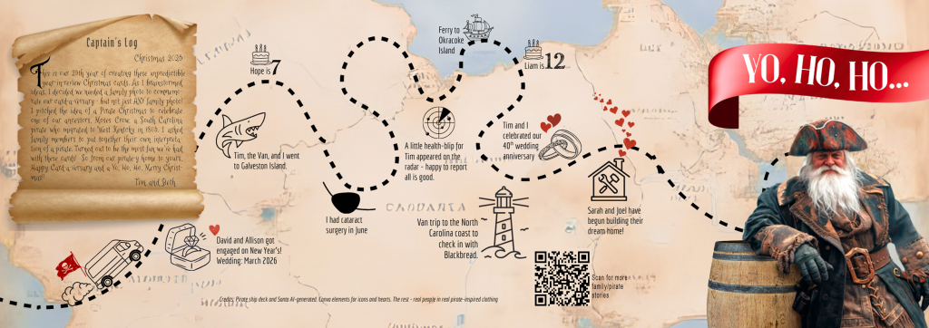 In September, with Moses on my mind and as Tim and I were meandering along the coast of North Carolina in “VanDalf the Gray”, we stood on the beach, looking at the place where Blackbeard was killed, and suddenly the theme for the Christmas card pounded me like the surf: “Yo, Ho, Ho! A Pirate Christmas!”